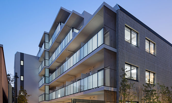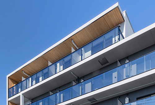 水平垂直ラインとガラス手摺を採用したスタイリッシュな外観は、バルコニーの天井と壁の一部に木目調のデザインを施し、洗練とぬくもりを感じる「和モダン」の建物をつくりあげました。周囲には白系の建物が多かったことから、本物件も濃色ではなく、白系のカラーリングにすることで、街並みとの調和を図っています。