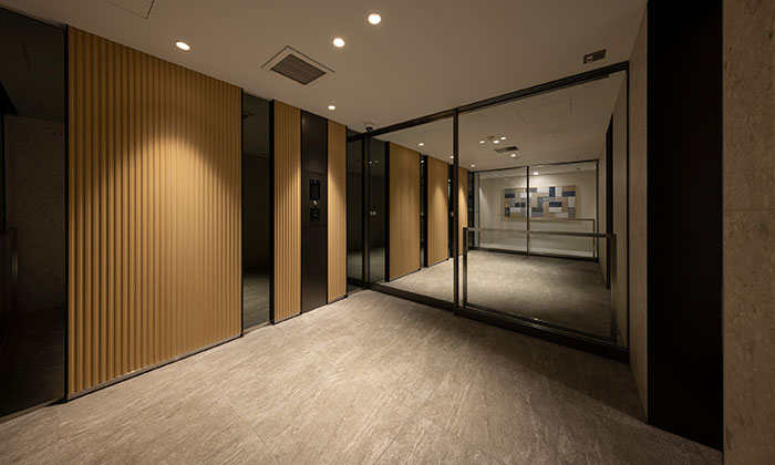床や壁に天然石を使ったエントランスを入ると、天然木でデザインされた壁・柔らかな空間が住民の方々を迎え入れます。そのまま歩みを進めると、正面の壁にアートがあらわれます。モザイク状のデザインが印象的ですが、その一つひとつに不要になった布が使われているエコな作品です。木や天然石、布などの自然素材に包まれた和モダンな空間が、洗練とぬくもりの空気感を醸し出しています。