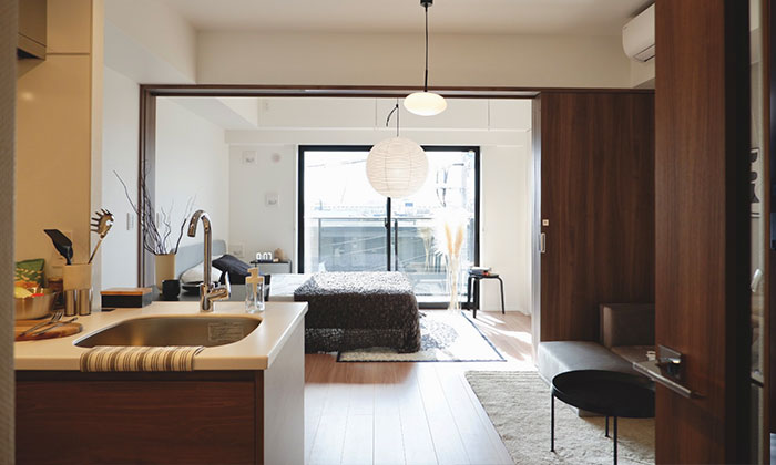 部屋の仕切りも引き戸にすることで、ひとつながりにも個室としても使える、さらに1Kタイプにはテレワークを想定してワークデスクを据えつけています。収納についても、1LDKにウォークインクロゼットやシューズクロークを設けたり、スペースを有効利用して収納を増やして、すっきりした住空間で暮らせるよう配慮しています。さらに、間口を広く取ることで、視覚的にも部屋の広さを感じられる工夫を施しています。