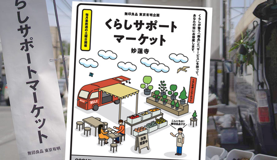 スタイリオ妙蓮寺Ⅲの敷地内にて東急株式会社と無印良品東京有明、そして地域の不動産業者の住まいの松栄が協力して開催する「くらしサポートマーケット」。毎月、妙蓮寺に住む皆さまの暮らしを整えるお手伝いをするため「無印良品東京有明」と、松栄選りすぐりの地元名店「余白出店」が素敵な商品をお届けします。