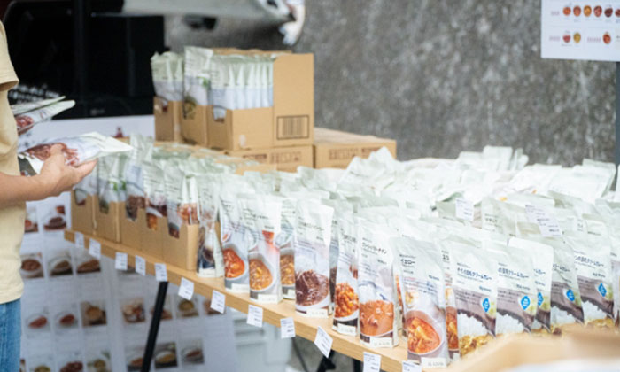 無印良品の新しくなった防災セットと、防災に使えるアイテム、便利なレトルトカレー全種43 種類などを出品。余白出店は、大倉山にある植物と道具のお店「PLANTED」