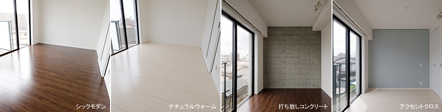 ・床面には2種類のフローリング(シックモダン、ナチュラルウォーム)、壁面には打ち放しコンクリートやアクセントクロスなど、
