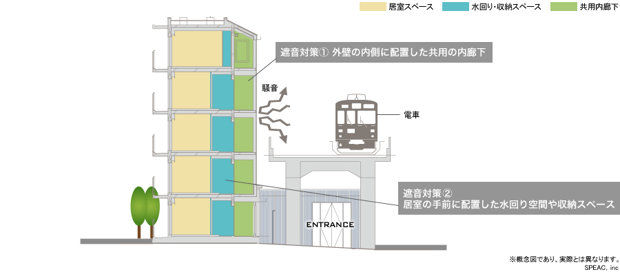 高架下を住戸へのゲートに利用したデザイン計画。橋脚の間に箱を連続させることで、プライベート空間へと引き込むリズムを創出。