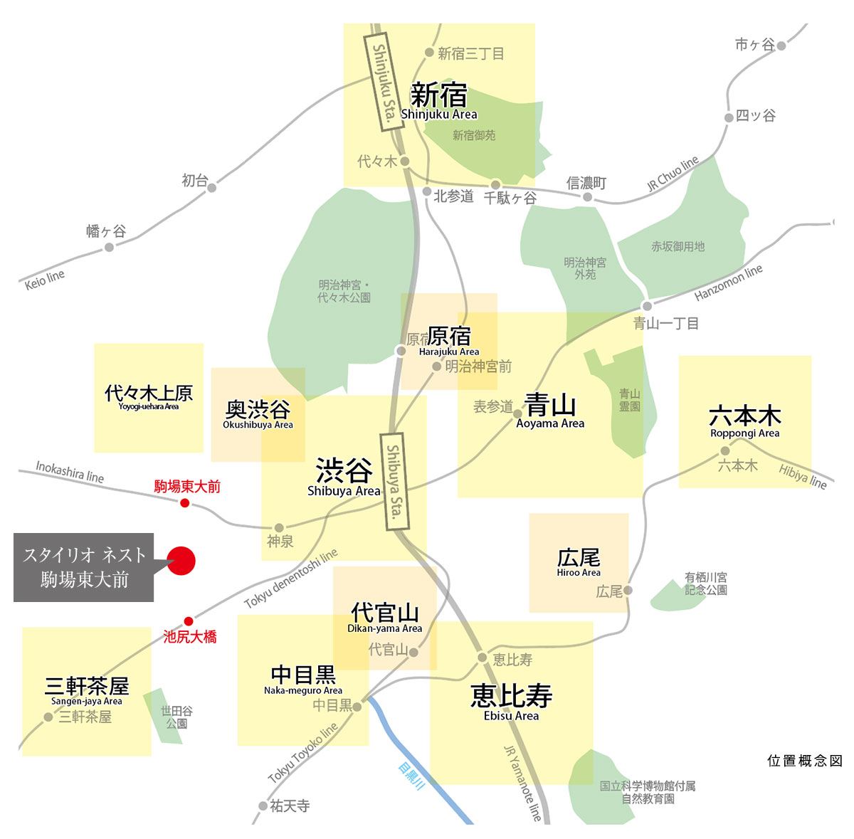 大規模再開発、奥渋谷、知的好奇心を叶える渋谷文化など多彩な顔をもつ街渋谷駅へ1駅。駒場東大前駅、池尻大橋駅の2路線の利用が可能です。