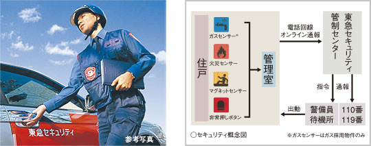 共用部や専有部で火災や異常侵入が発生し、各種センサーが作動した場合には、必要に応じて東急セキュリティが現場に急行。沿線を知り尽くした地域密着型のサービスにより、迅速に対応します。