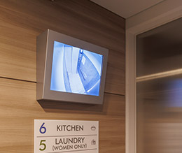 - 1階エレベーターホールに、モニターを設置。エレベーターに乗る前に内部を確認できるので、エレベーター利用の安心感が高まります。